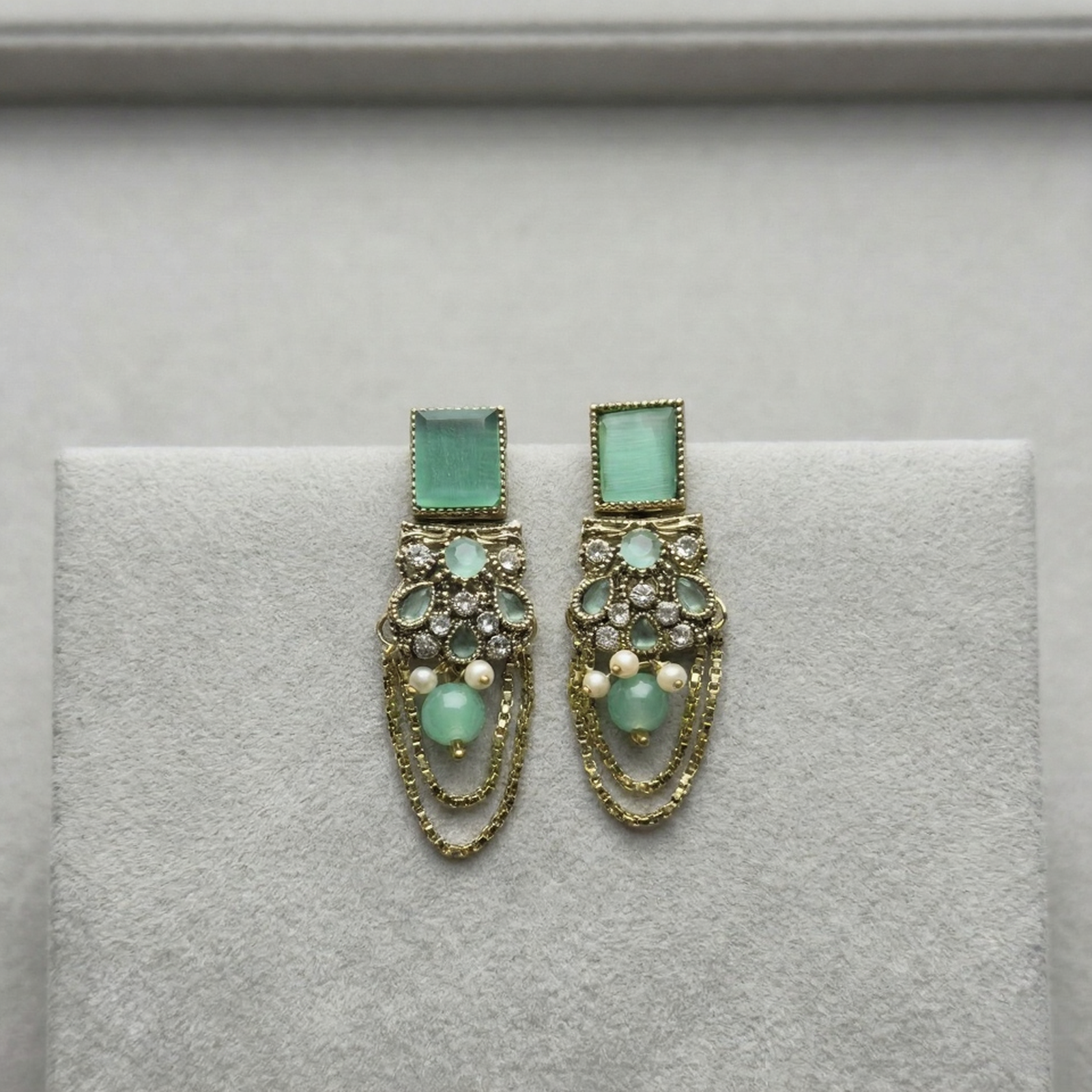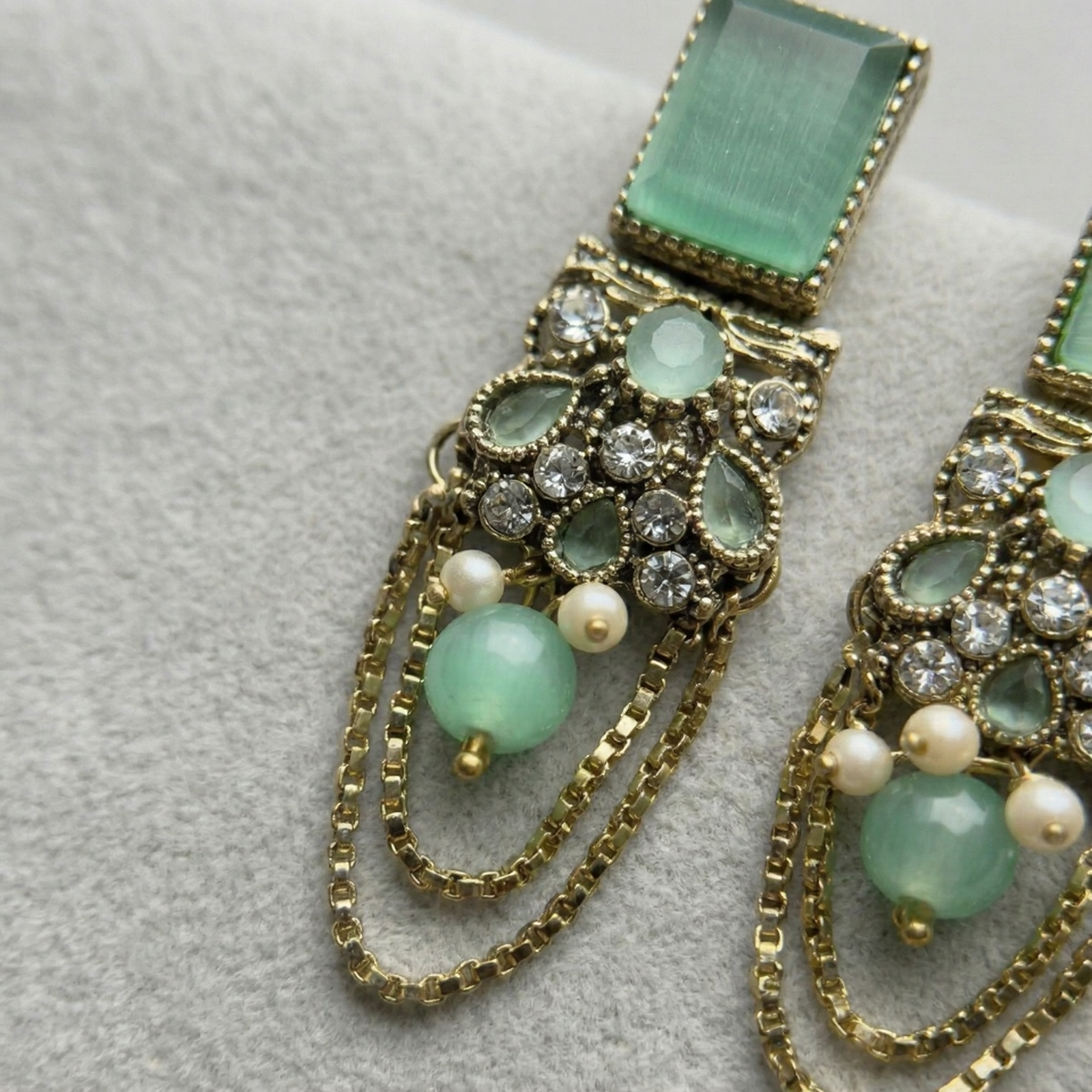 Elevate your jewelry collection with these intricately crafted Vintage-Style Chandelier Earrings. Featuring a sophisticated blend of seafoam green stones and shimmering crystal accents, these earrings are designed to capture the light and the room’s attention. The top of each piece begins with a rectangular cabochon in a matte mint finish, leading down to a cluster of teardrop stones and delicate faux pearls.