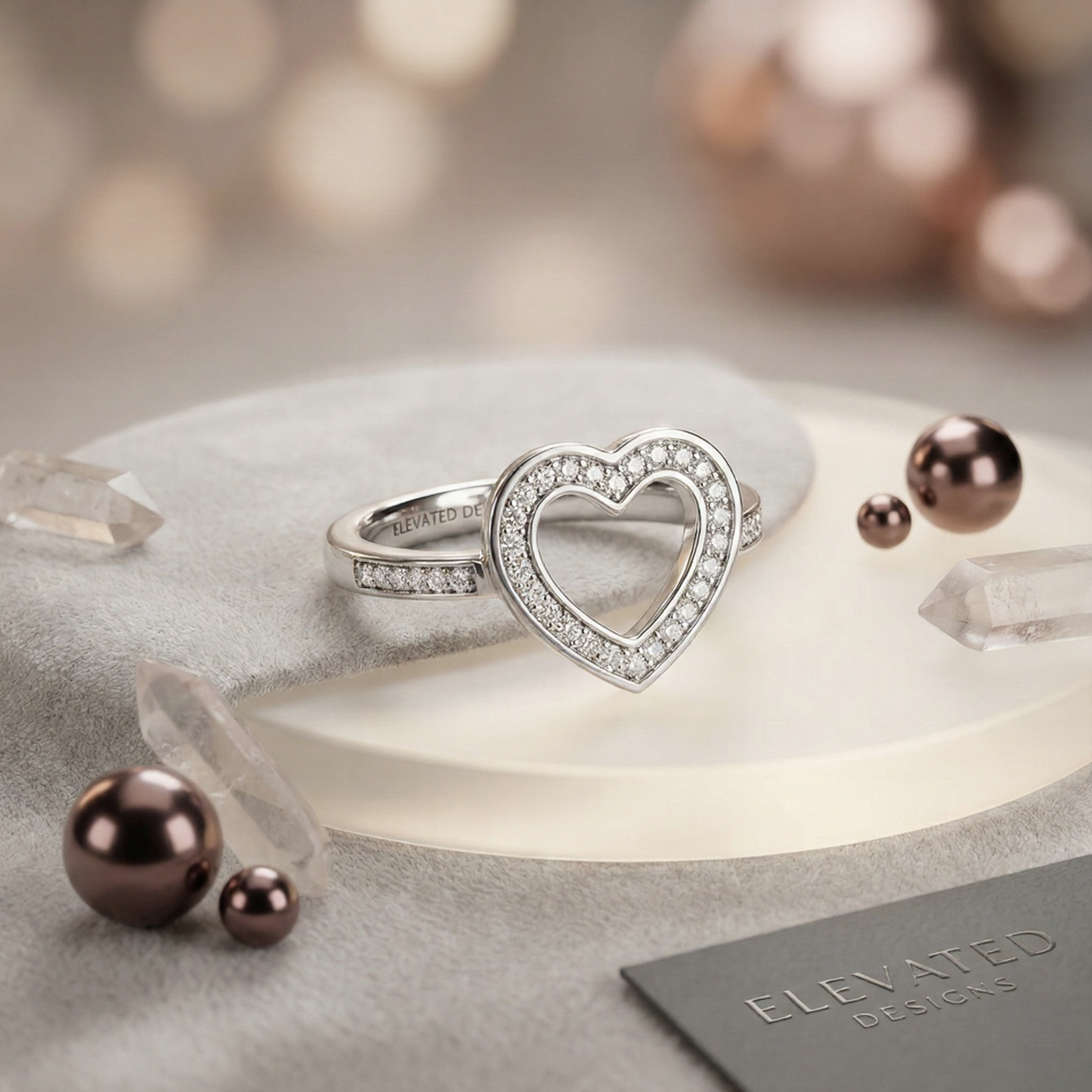 Celebrate love in its most elegant form with the “Pure Affection” Open Heart Ring. This piece features a beautifully hollowed, open-heart silhouette that rests gracefully atop a slender, polished band. The design strikes a perfect balance between minimalist structure and luxurious detail.